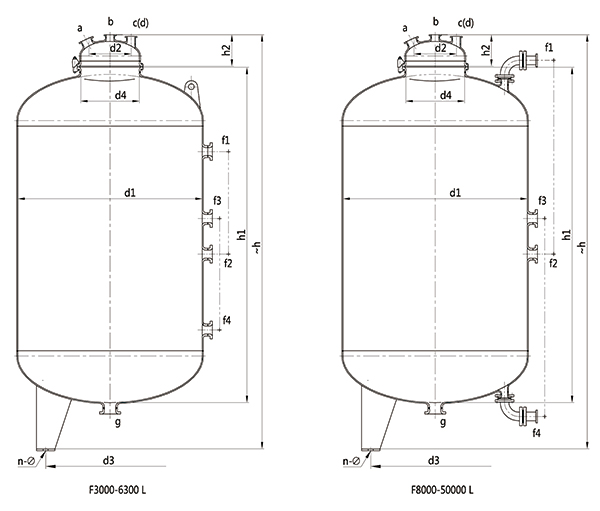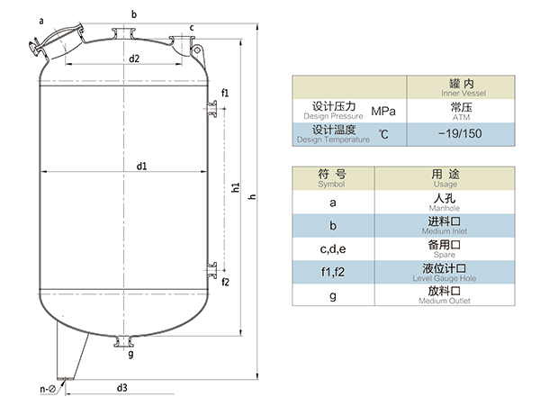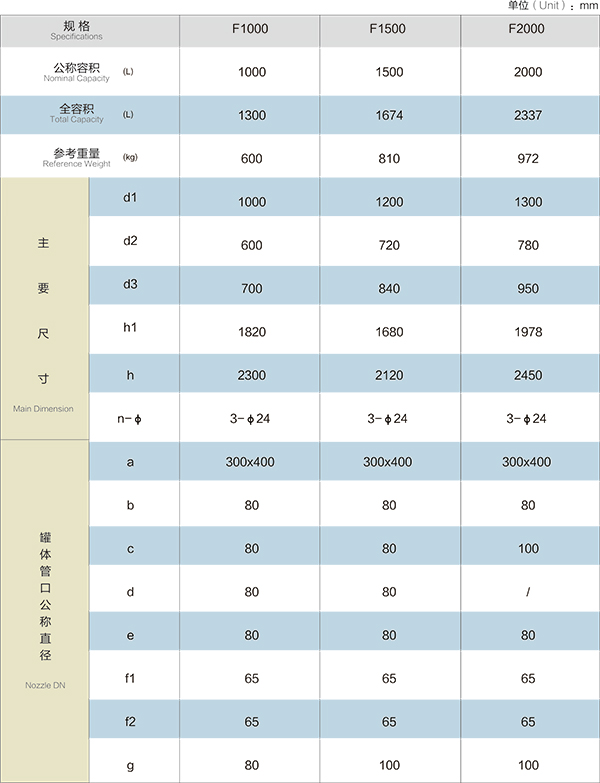 F1000L\F1500L\F2000L閉式搪玻璃貯罐(閉式搪玻璃儲罐)設(shè)計(jì)圖紙及參數(shù)如下所示: