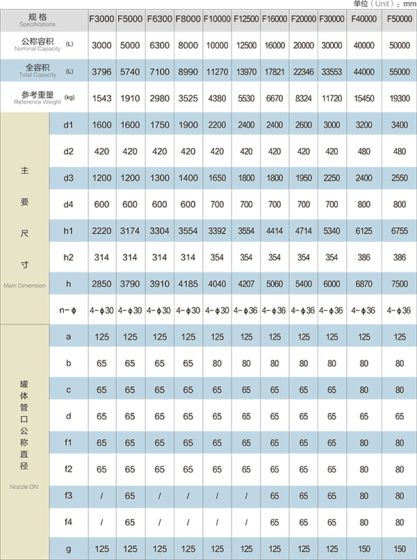 F3000L-F50000L閉式搪玻璃貯罐(閉式搪玻璃儲罐)設(shè)計(jì)圖紙及參數(shù)如下所示: