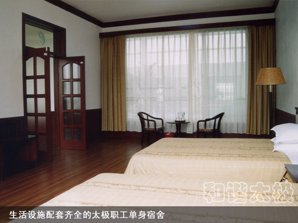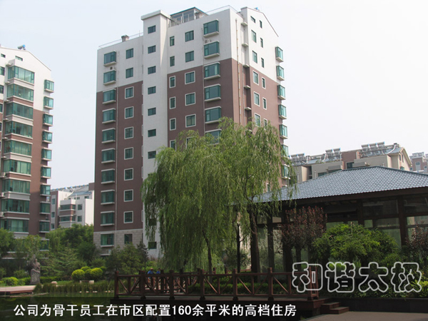 2008年,太極公司投資近8000萬元建成了職工公寓樓3座,戶外綠樹溪湖環(huán)繞,每戶面積170平米,統(tǒng)一配置60寸夏普電視等。所建成的職工單身公寓樓采用四星級標(biāo)準(zhǔn),共176間房,人均戶面積50平米,統(tǒng)一配置電視、網(wǎng)絡(luò)、洗浴間、床柜、空調(diào)、暖氣、桌椅等。而且單身公寓內(nèi)設(shè)有3000余平方米的生態(tài)園林和高檔游泳池,一年四季綠樹茂盛常春。