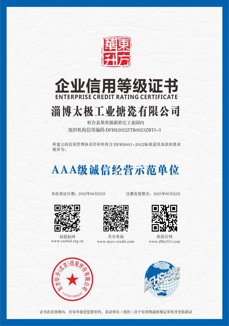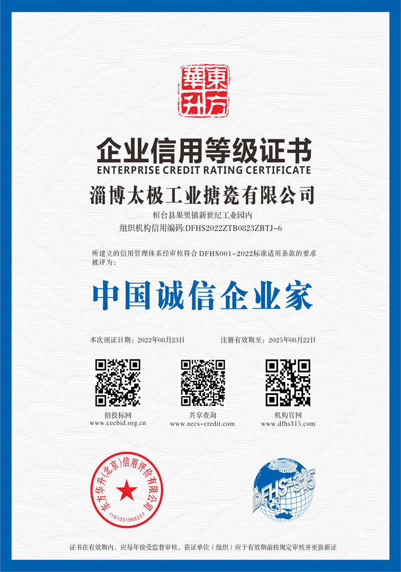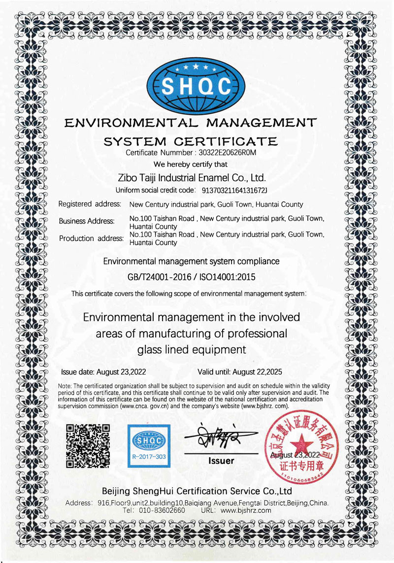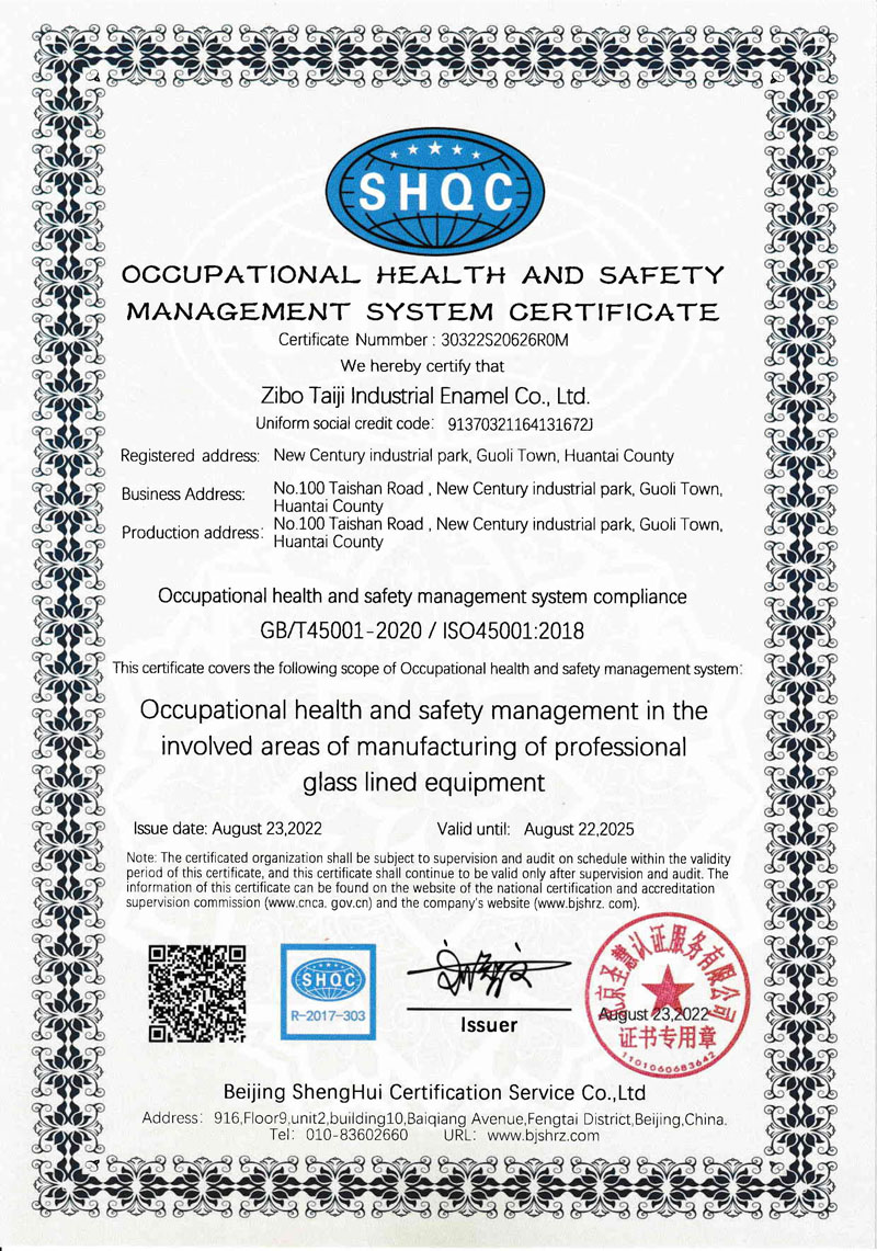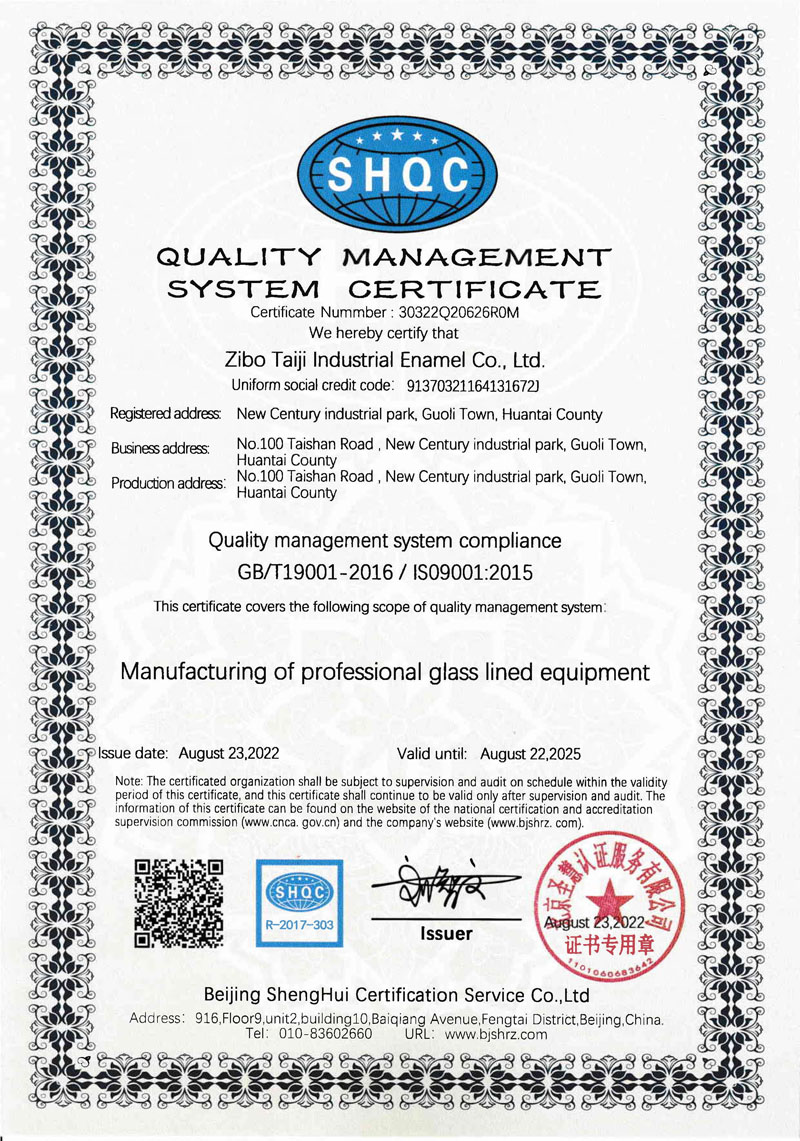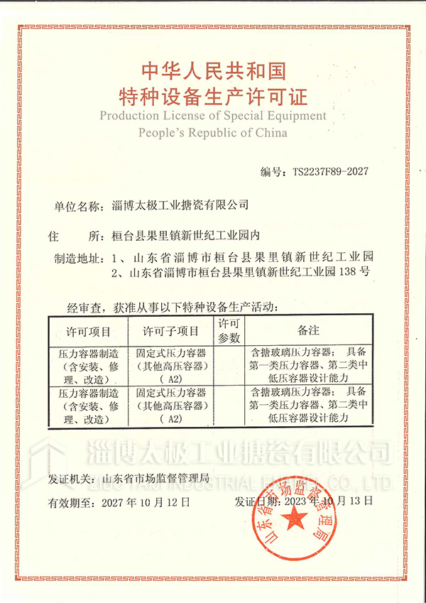 淄博太極在中國搪玻璃設(shè)備制造行業(yè)中首家通過ISO90001質(zhì)量體系認(rèn)證,并擁有美國ASME認(rèn)證、歐洲PED認(rèn)證以及國家部門頒發(fā)的搪玻璃制造許可證、進(jìn)出口許可證和百余項榮譽(yù)證以及三十六項專利等。
